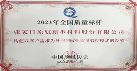 2023-12-072023年12月,張家口原軾新型材料股份有限公司憑借 “構建以客戶需求為導向的敏捷質(zhì)量管控模式的經(jīng)驗”,榮獲2023年全國質(zhì)量標桿企業(yè)。